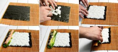 Ryż do sushi można przyrządzić zgodnie z przepisem na opakowaniu, ja robię go z wykorzystaniem wskazówek, które znalazłam kiedyś w książce o kuchni japońskiej: Ryż wsypujemy na sitko. Płuczemy go dokładnie pod bieżącą wodą. Następnie podstawiamy naczynie z wodą (ja nie wysypuję ryżu z sitka) i płuczemy go ponownie. Woda zrobi się mleczna. Wodę zmieniamy i płuczemy ryż do czasu, aż woda będzie przezroczysta (około 5 razy). Następnie ryż zostawiamy na sitku do odcieknięcia na ok. 15 minut. Ryż przesypujemy do rondelka i zalewamy zimną wodą – na 500 g ryżu potrzebujemy 750 ml wody. Dodajemy dużą szczyptę soli. Do wody warto dodać łyżkę sake dla smaku, ale niekoniecznie (ja miałam akurat w domu, ale jeśli nie macie to nie kupujcie specjalnie). Ryż gotujemy na dużym ogniu, aż do zagotowania. Gdy się tylko zagotuje zmniejszamy ogień na mały, przykrywamy ryż pokrywką i gotujemy 15 minut. Po tym czasie zdejmujemy rondel z ognia. Zdejmujemy pokrywkę, nakrywamy rondel bawełnianą ściereczką złożoną na pół, która zaabsorbuje nadmiar wilgoci, a na to ponownie nakładamy pokrywkę. Zostawiamy tak ryż jeszcze na 10 minut.